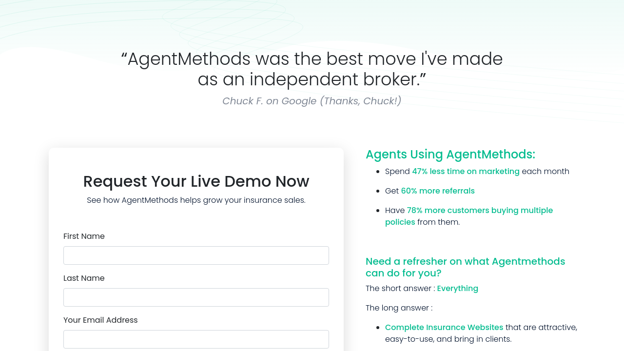 AgentMethods Website Builder is a powerful solution built exclusively for independent insurance agents who are looking for a comprehensive website and marketing platform. Designed to simplify the process of launching and managing a high-quality website, AgentMethods combines state-of-the-art design with seamless functionality, making it effortless to attract, retain, and nurture client relationships. By integrating easy-to-use website building with automated marketing tools, this platform enables agents to maintain a dynamic online presence that supports business growth.