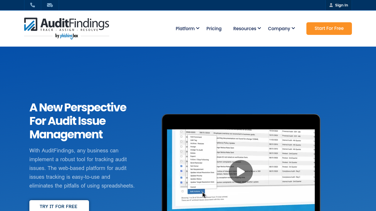 AuditFindings.com is a state‐of‐the‐art web-based tool built specifically for audit issues tracking. Designed with audit and compliance departments in mind, AuditFindings eliminates the pitfalls associated with managing multiple spreadsheets while offering a robust issue management solution that simplifies audit tracking and oversight.