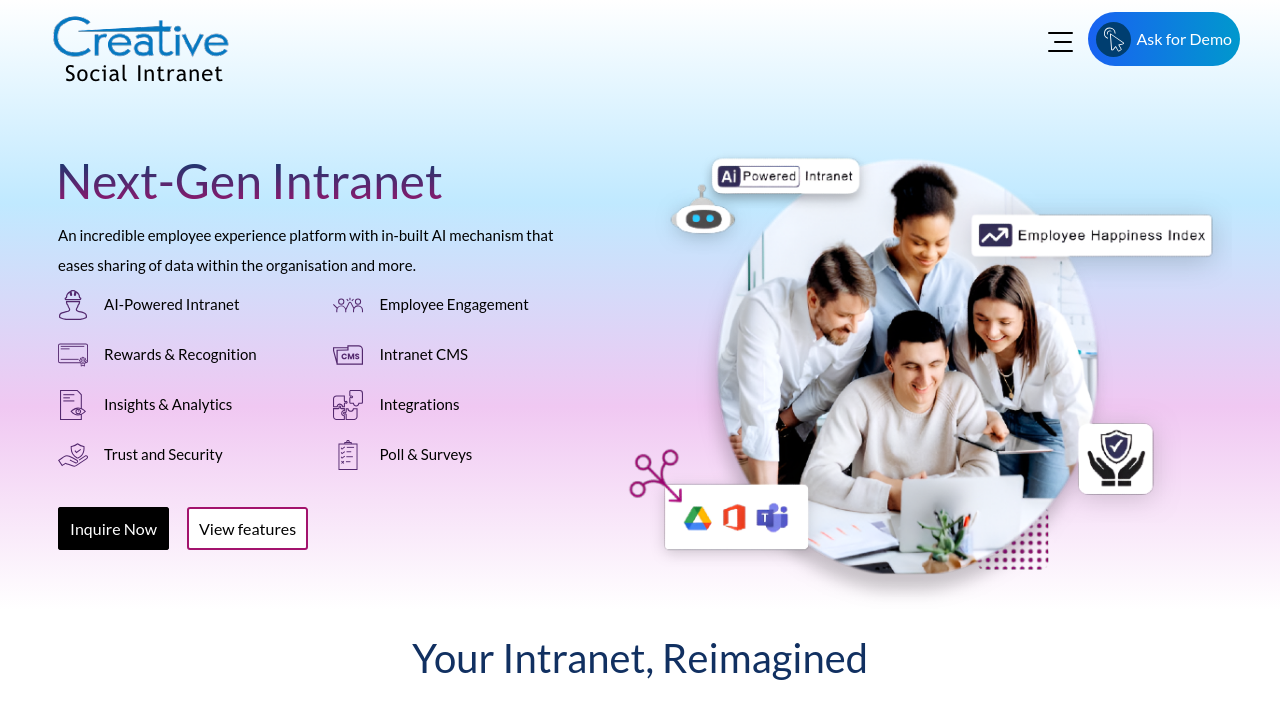 Creative Social Intranet is a next-generation employee intranet portal designed to enhance internal communication and foster employee engagement. Developed with powerful AI capabilities, this innovative digital workplace streamlines various activities—from sharing company news to celebrating milestones—making it a comprehensive solution for modern organizations. Available as both a web-based and mobile app solution, it offers the flexibility of on-premise, on-cloud, or hybrid deployments while allowing seamless integration with your existing legacy applications.