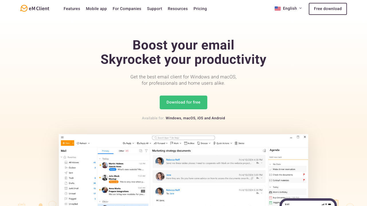 eM Client is a versatile email client for Windows and macOS, designed to simplify your email and productivity needs. It integrates email, calendar, contacts, tasks, notes, and chat into a clean, user-friendly interface. Compatible with major services like Gmail, Exchange, and Outlook, it offers seamless account setup and data import. Whether for personal or professional use, eM Client streamlines communication with advanced tools like snooze email, send later, and built-in translation.