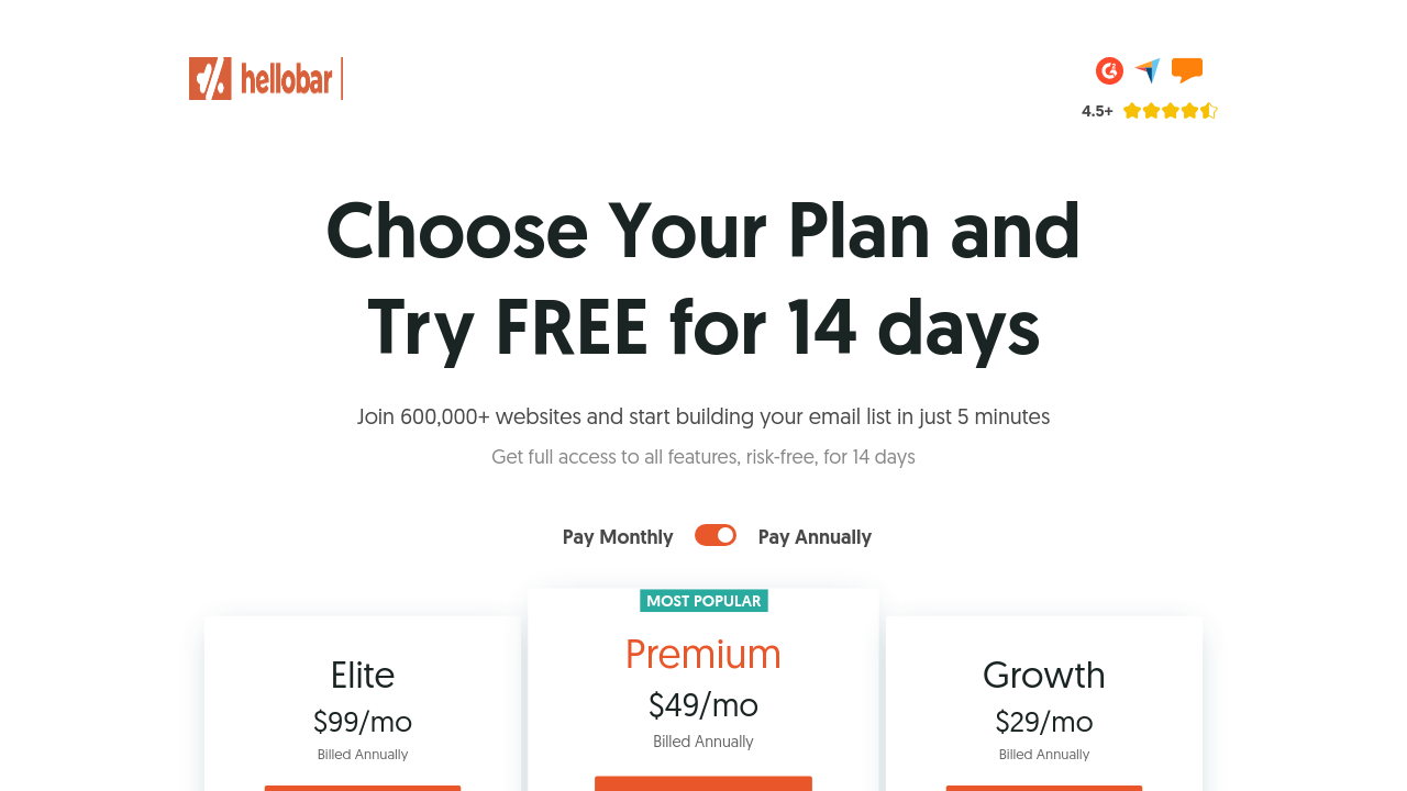 This only an estimated pricing range, visit Hello Bar pricing page to access all the information by clicking “Visit Now”.
