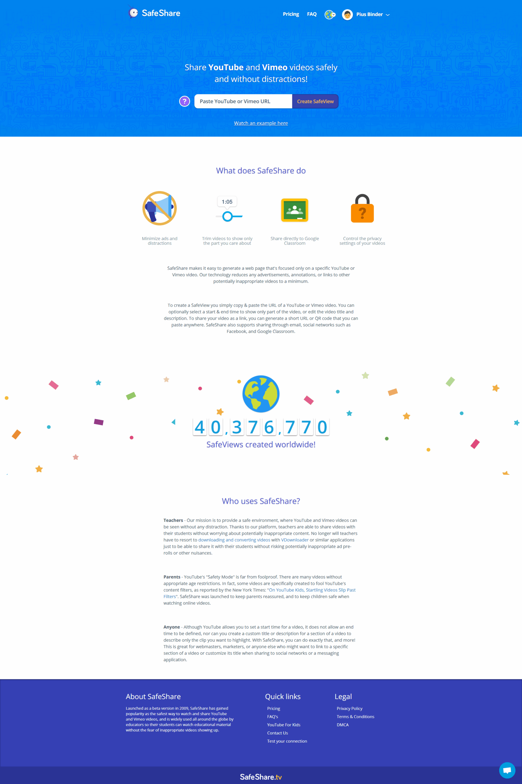 SafeShare.tv ensures distraction-free video sharing by removing ads, annotations, and inappropriate content from YouTube and Vimeo videos. It allows users to create SafeViews, customize playback, and generate secure links or QR codes for easy sharing. Designed for classrooms and professionals, it provides a safe, streamlined way to share video content without unwanted interruptions.