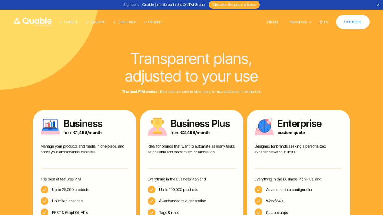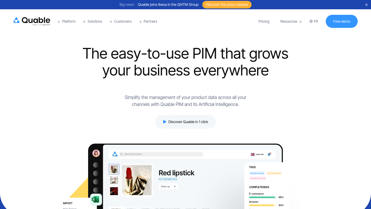 Quable PIM is a state-of-the-art SaaS platform designed to centralize, organize, and enrich product data for brands, manufacturers, and distributors. Built for agile omnichannel distribution, this innovative solution helps businesses rapidly synchronize product information across sales and communication channels. With its smart interface and AI-powered data enrichment, Quable PIM streamlines everything from catalog management and digital asset organization to localized content for global expansion.